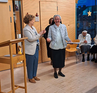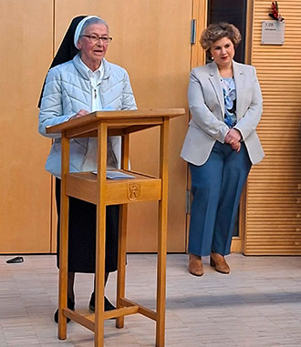 Umrahmt wurde die Feier musikalisch von unserer Organistin, Frau Anna Maria Knoll, ihrer Tochter Vera und drei jungen Schwestern aus dem Kloster in Strahlfeld. Frau Dr. Vera Knoll hielt auch eine Laudatio auf Sr. Flavia, die sich zwar nicht gerne "Künstlerin" nenne, aber doch eine sei.